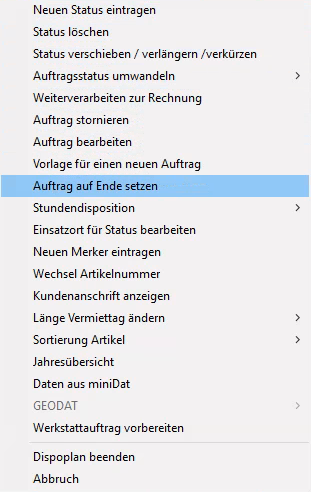 Die Freimeldung erfolgt über das Kontextmenü (Rechtsklick auf den Mietauftrag) in AFD "Auftrag auf Ende setzen".