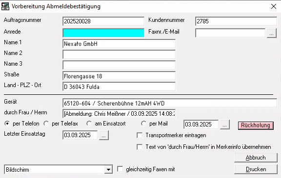 Im sich daraufhin öffnenden Fenster „Vorbereitung Abmeldebestätigung“ kann dann nach Eingabe bzw. Korrektur der relevanten Daten eine Rückholung bzw. Rücknahme mit Fälligkeit zum letzten Miettag direkt per Klick auf den Button „Rückholung“ generiert werden – ohne dass man noch einmal extra in den Auftrag springen muss.